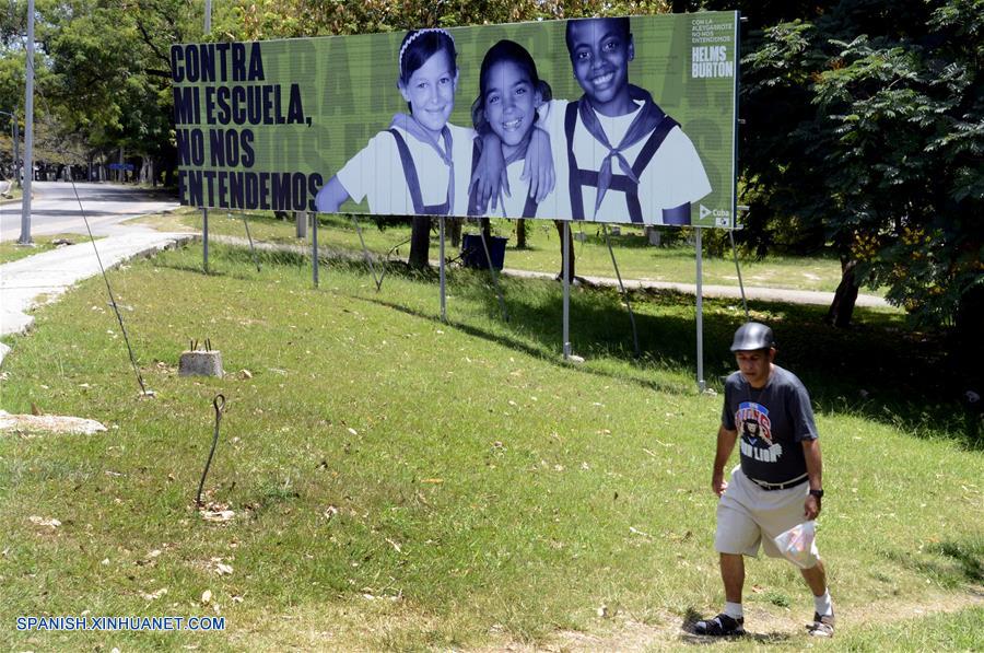LA HABANA, 5 mayo, 2019 (Xinhua) -- Una persona camina frente a un cartel en el municipio Plaza de la Revolución, en La Habana, capital de Cuba, el 5 de mayo de 2019. Políticos, funcionarios y académicos cubanos han reaccionado con enérgico rechazo a la activación total por parte de Estados Unidos de la Ley Helms-Burton, que desde 1996 codifica el entramado legal del bloqueo impuesto a la isla hace más de medio siglo por la Casa Blanca. (Xinhua/Joaquín Hernández)