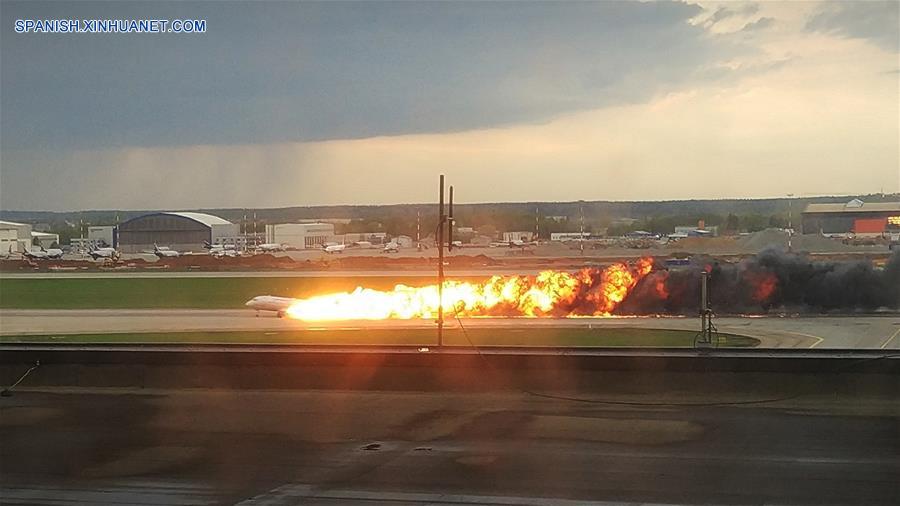 Fuego emana de un avión de pasajeros durante su aterrizaje de emergencia en en el Aeropuerto Internacional de Sheremetyevo, en Moscú, Rusia, el 5 de mayo de 2019. El Comité de Investigación de Rusia confirmó que sobrevivieron 37 de las 78 personas a bordo de un avión de pasajeros SSJ-100 en ruta hacia la ciudad rusa de Murmansk que se incendió el domingo durante un aterrizaje de emergencia en el Aeropuerto Internacional de Sheremetyevo en Moscú. (Xinhua/Sergei)