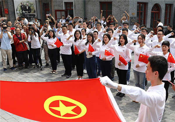 Estudiantes de la Universidad de Beijing expresan este sábado el juramento de la Liga Juvenil Comunista de China frente al Memorial del Movimiento de la Nueva Cultura, en Beijing, en conmemoración del centenario del Movimiento del Cuatro de Mayo. (Foto: Zhu Xingxin/ China Daily)