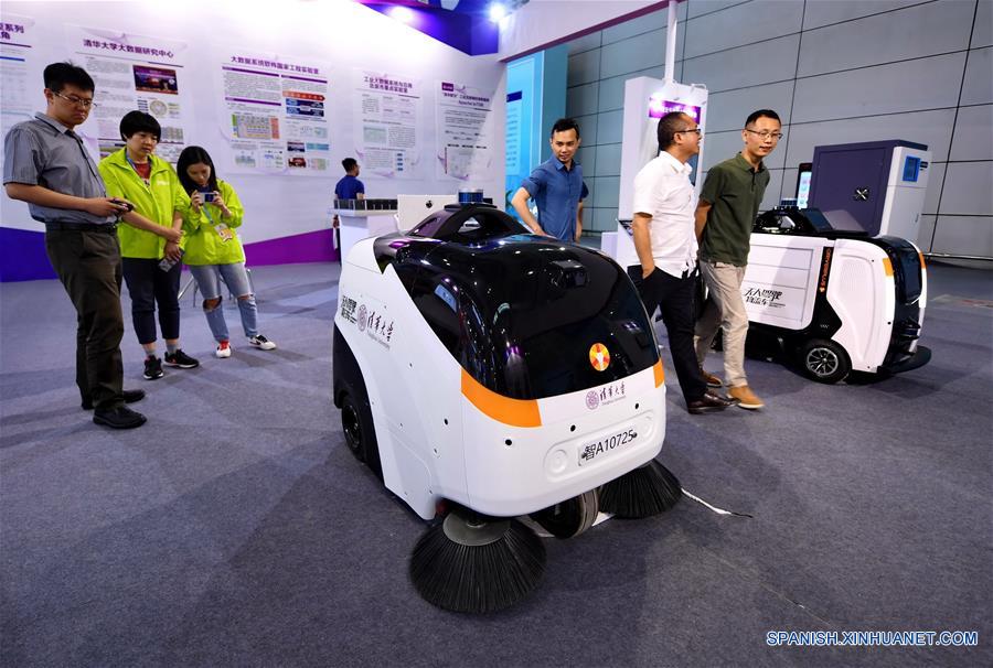 FUJIAN, 5 mayo, 2019 (Xinhua) -- Visitantes observan un vehículo de limpieza de piloto automático (i) y un vehículo de logística de piloto automático (d) en la Segunda Exposición Digital de China, en Fuzhou, provincia de Fujian, en el sureste de China, el 5 de mayo de 2019. La Segunda Exposición Digital de China se realiza del 5 al 9 de mayo en el Centro de Conferencia y Exposición Internacional del del Estrecho de Fuzhou. (Xinhua/Lin Shanchuan)