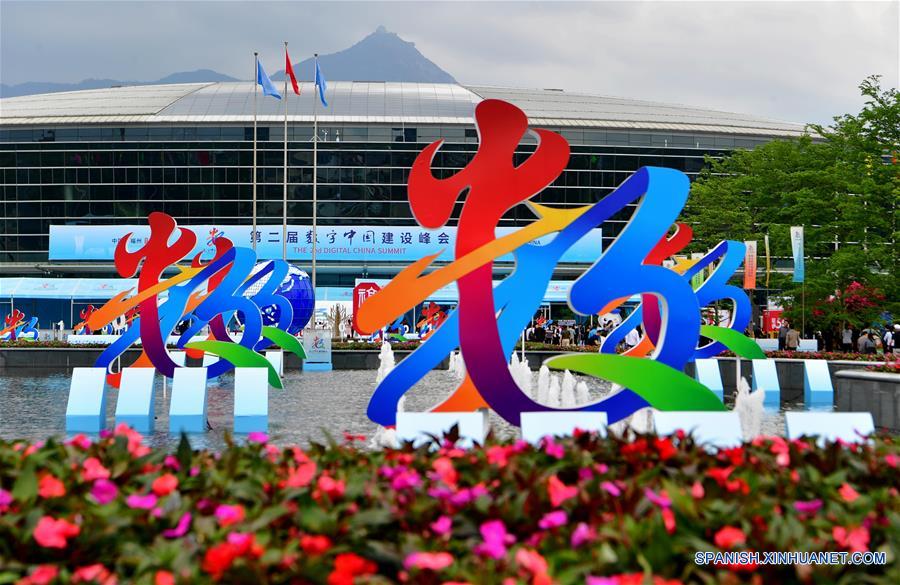 FUJIAN, 5 mayo, 2019 (Xinhua) -- Vista de piezas artísticas frente al Centro de Conferencia y Exposición Internacional del Estrecho de Fuzhou, donde se realiza la Segunda Exposición Digital de China en Fuzhou, provincia de Fujian, en el sureste de China, el 5 de mayo de 2019. La Segunda Exposición Digital de China se realiza del 5 al 9 de mayo en el Centro de Conferencia y Exposición Internacional del Estrecho de Fuzhou. (Xinhua/Wei Peiquan)