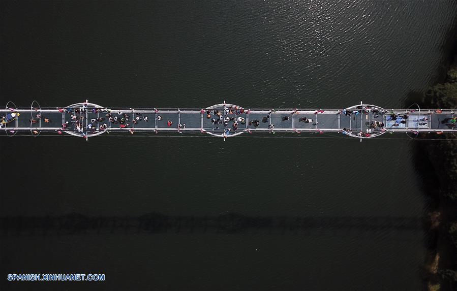 Imagen aérea del 1 de mayo de 2019 de turistas caminando sobre el puente de cristal en el municipio de Wanda, en el condado de Danzhai, en la Prefectura Autónoma Miao y Dong de Qiandongnan, en la provincia de Guizhou, en el suroeste de China. China registró un total de 195 millones de viajes de turistas nacionales durante los cuatro días de vacaciones por el Día del Trabajo, lo que significa un incremento de 13,7 por ciento respecto al a?o pasado, informó el Ministerio de Cultura y Turismo. Los ingresos por turismo durante las vacaciones del miércoles al sábado ascendieron a 117.670 millones de yuanes (unos 17.480 millones de dólares), con un aumento interanual de 16,1 por ciento, indicó el ministerio. Datos estadísticos muestran que los viajes familiares han sido el fenómeno más destacado en el sector de turismo, lo que impulsa el consumo cultural, recreativo y de catering. Los turistas permanecen en promedio 2,25 días en los destinos que visitan, se?aló el ministerio. (Xinhua/Huang Xiaohai)