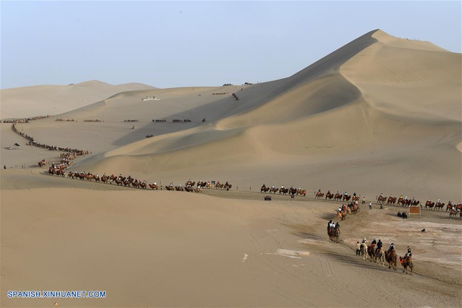 Imagen del 1 de mayo de 2019 de turistas montando camellos en el área escénica de la Duna de Arena Mingsha y el Manantial de la Media Luna, en Dunhuang, en la provincia de Gansu, en el noroeste de China. China registró un total de 195 millones de viajes de turistas nacionales durante los cuatro días de vacaciones por el Día del Trabajo, lo que significa un incremento de 13,7 por ciento respecto al a?o pasado, informó el Ministerio de Cultura y Turismo. Los ingresos por turismo durante las vacaciones del miércoles al sábado ascendieron a 117.670 millones de yuanes (unos 17.480 millones de dólares), con un aumento interanual de 16,1 por ciento, indicó el ministerio. Datos estadísticos muestran que los viajes familiares han sido el fenómeno más destacado en el sector de turismo, lo que impulsa el consumo cultural, recreativo y de catering. Los turistas permanecen en promedio 2,25 días en los destinos que visitan, se?aló el ministerio. (Xinhua/Fan Peishen)