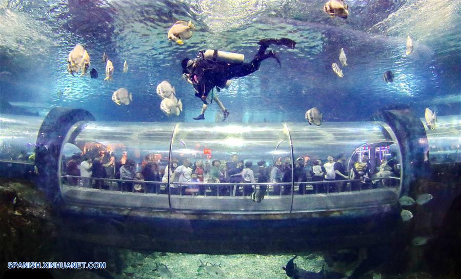 Imagen del 2 de mayo de 2019 de turistas divirtiéndose en el Acuario de Xin'ao, en Qinhuangdao, en la provincia de Hebei, en el norte de China. China registró un total de 195 millones de viajes de turistas nacionales durante los cuatro días de vacaciones por el Día del Trabajo, lo que significa un incremento de 13,7 por ciento respecto al a?o pasado, informó el Ministerio de Cultura y Turismo. Los ingresos por turismo durante las vacaciones del miércoles al sábado ascendieron a 117.670 millones de yuanes (unos 17.480 millones de dólares), con un aumento interanual de 16,1 por ciento, indicó el ministerio. Datos estadísticos muestran que los viajes familiares han sido el fenómeno más destacado en el sector de turismo, lo que impulsa el consumo cultural, recreativo y de catering. Los turistas permanecen en promedio 2,25 días en los destinos que visitan, se?aló el ministerio. (Xinhua/Cao Jianxiong)