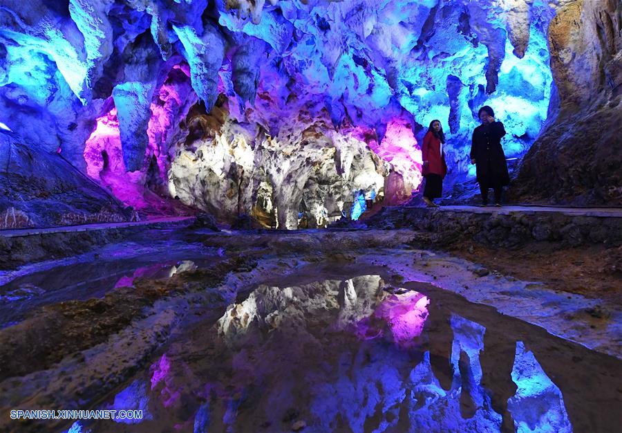 Imagen del 3 de mayo de 2019 de turistas observando el paisaje cárstico dentro de una cueva en el condado Fuyuan, en la provincia Yunnan, en el suroeste de China. China registró un total de 195 millones de viajes de turistas nacionales durante los cuatro días de vacaciones por el Día del Trabajo, lo que significa un incremento de 13,7 por ciento respecto al a?o pasado, informó el Ministerio de Cultura y Turismo. Los ingresos por turismo durante las vacaciones del miércoles al sábado ascendieron a 117.670 millones de yuanes (unos 17.480 millones de dólares), con un aumento interanual de 16,1 por ciento, indicó el ministerio. Datos estadísticos muestran que los viajes familiares han sido el fenómeno más destacado en el sector de turismo, lo que impulsa el consumo cultural, recreativo y de catering. Los turistas permanecen en promedio 2,25 días en los destinos que visitan, se?aló el ministerio. (Xinhua/Yang Zongyou)