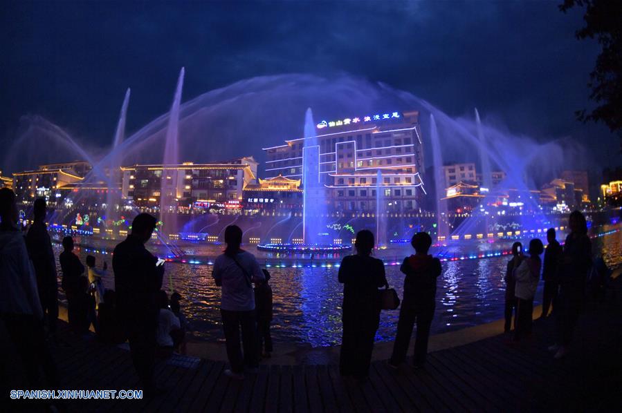 Imagen del 3 de mayo de 2019, de personas observando un espectáculo de luces y agua en el río Gongshui durante la celebración del Día del Trabajo, en el condado Xuan'en la Prefectura Autónoma Tujia y Miao de Enshi, en la provincia de Hubei, en el centro de China. China registró un total de 195 millones de viajes de turistas nacionales durante los cuatro días de vacaciones por el Día del Trabajo, lo que significa un incremento de 13,7 por ciento respecto al a?o pasado, informó el Ministerio de Cultura y Turismo. Los ingresos por turismo durante las vacaciones del miércoles al sábado ascendieron a 117.670 millones de yuanes (unos 17.480 millones de dólares), con un aumento interanual de 16,1 por ciento, indicó el ministerio. Datos estadísticos muestran que los viajes familiares han sido el fenómeno más destacado en el sector de turismo, lo que impulsa el consumo cultural, recreativo y de catering. Los turistas permanecen en promedio 2,25 días en los destinos que visitan, se?aló el ministerio. (Xinhua/Song Wen)