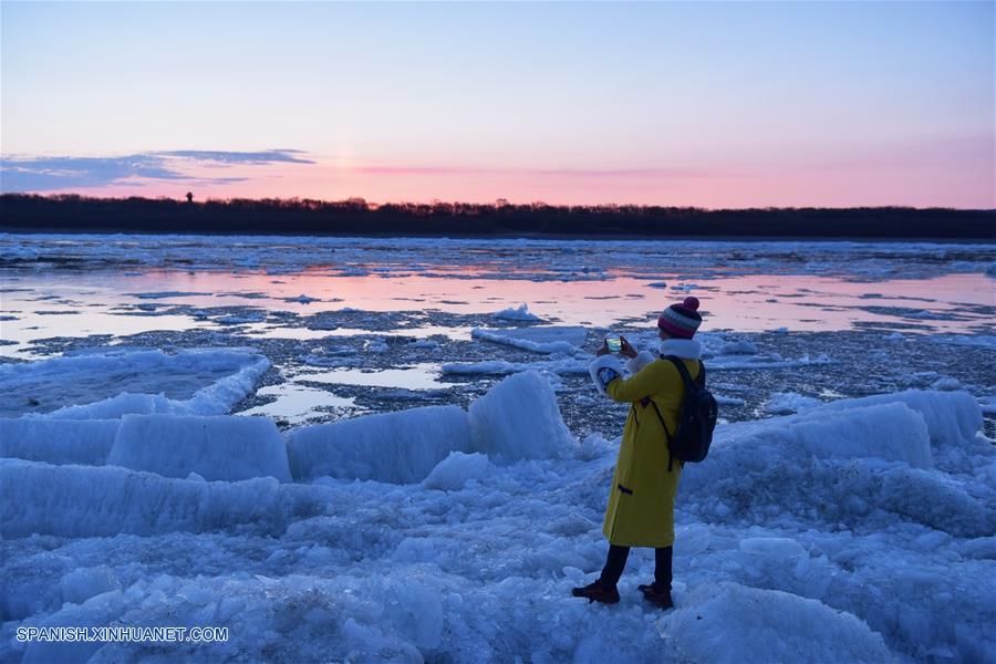 HEILONGJIANG, 6 mayo, 2019 (Xinhua) -- Imagen del 3 de mayo de 2019 de una turista tomando fotografías del deshielo en la sección Huma del río Heilongjiang, en la provincia de Heilongjiang, en el noreste de China. China registró un total de 195 millones de viajes de turistas nacionales durante los cuatro días de vacaciones por el Día del Trabajo, lo que significa un incremento de 13,7 por ciento respecto al a?o pasado, informó el Ministerio de Cultura y Turismo. Los ingresos por turismo durante las vacaciones del miércoles al sábado ascendieron a 117.670 millones de yuanes (unos 17.480 millones de dólares), con un aumento interanual de 16,1 por ciento, indicó el ministerio. Datos estadísticos muestran que los viajes familiares han sido el fenómeno más destacado en el sector de turismo, lo que impulsa el consumo cultural, recreativo y de catering. Los turistas permanecen en promedio 2,25 días en los destinos que visitan, se?aló el ministerio. (Xinhua/Zhou Changping)