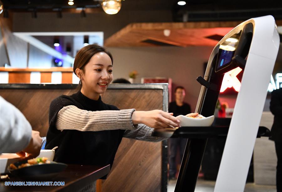 Imagen del 10 de noviembre de 2018 de un robot sirviendo alimentos en un restaurante inteligente operado por el gigante del comercio electrónico de China JD.com, en Tianjin, en el norte de China. La economía digital de China alcanzó los 31,3 billones de yuanes (unos 4,6 billones de dólares) en 2018, lo que representa un 34,8 por ciento del producto interior bruto (PIB) total del país, según un informe publicado el lunes por la Administración del Ciberespacio de China. El documento, dado a conocer en la presente 2a Cumbre Digital de China en la ciudad suroriental de Fuzhou, muestra que el sistema de innovación del país mejoró de forma continua. Los préstamos pendientes de empresas de ciencia y tecnología de China se ubicaron en 3,53 billones de yuanes al cierre del a?o pasado. La economía digital ha fomentado y fortalecido los nuevos motores de desarrollo del país, con 31,63 billones de yuanes de volumen de comercio electrónico y más de 9 billones de yuanes de ventas minoristas en línea en 2018, así como más de 600 millones de usuarios de pagos en línea, indica el informe. (Xinhua/Li Ran)