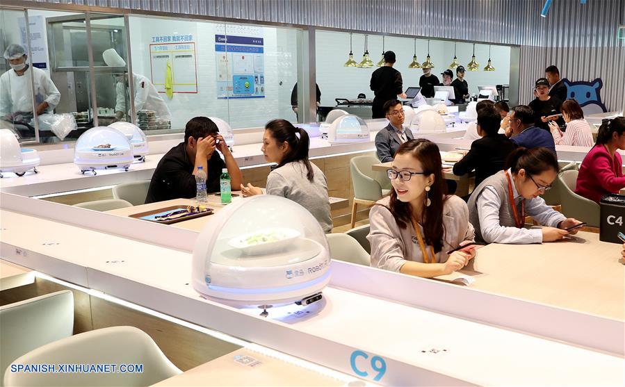 Imagen del 15 de octubre de 2018 de un robot AGV (vehículo guiado automáticamente) sirviendo comida a los clientes en un restaurante inteligente operado por el gigante del comercio electrónico chino Alibaba, en el Centro Nacional de Exposiciones y Convenciones, en Shanghai, en el este de China. La economía digital de China alcanzó los 31,3 billones de yuanes (unos 4,6 billones de dólares) en 2018, lo que representa un 34,8 por ciento del producto interior bruto (PIB) total del país, según un informe publicado el lunes por la Administración del Ciberespacio de China. El documento, dado a conocer en la presente 2a Cumbre Digital de China en la ciudad suroriental de Fuzhou, muestra que el sistema de innovación del país mejoró de forma continua. Los préstamos pendientes de empresas de ciencia y tecnología de China se ubicaron en 3,53 billones de yuanes al cierre del a?o pasado. La economía digital ha fomentado y fortalecido los nuevos motores de desarrollo del país, con 31,63 billones de yuanes de volumen de comercio electrónico y más de 9 billones de yuanes de ventas minoristas en línea en 2018, así como más de 600 millones de usuarios de pagos en línea, indica el informe. (Xinhua/Fang Zhe)