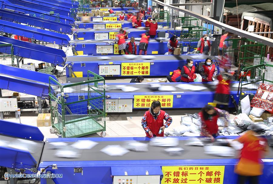 Imagen del 12 de noviembre de 2018 de empleados trabajando en el centro de distribución de la sucursal de Hengyang de China Post, en la ciudad de Hengyang, en la provincia de Hunan, en el centro de China. La economía digital de China alcanzó los 31,3 billones de yuanes (unos 4,6 billones de dólares) en 2018, lo que representa un 34,8 por ciento del producto interior bruto (PIB) total del país, según un informe publicado el lunes por la Administración del Ciberespacio de China. El documento, dado a conocer en la presente 2a Cumbre Digital de China en la ciudad suroriental de Fuzhou, muestra que el sistema de innovación del país mejoró de forma continua. Los préstamos pendientes de empresas de ciencia y tecnología de China se ubicaron en 3,53 billones de yuanes al cierre del a?o pasado. La economía digital ha fomentado y fortalecido los nuevos motores de desarrollo del país, con 31,63 billones de yuanes de volumen de comercio electrónico y más de 9 billones de yuanes de ventas minoristas en línea en 2018, así como más de 600 millones de usuarios de pagos en línea, indica el informe. (Xinhua/Cao Zhengping)