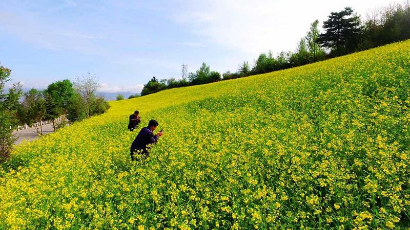 Parque de la monta?a Quiqing en Zhangxian, provincia de Gansu, lleno de colza florecida. [Foto: Wang Jinsheng]