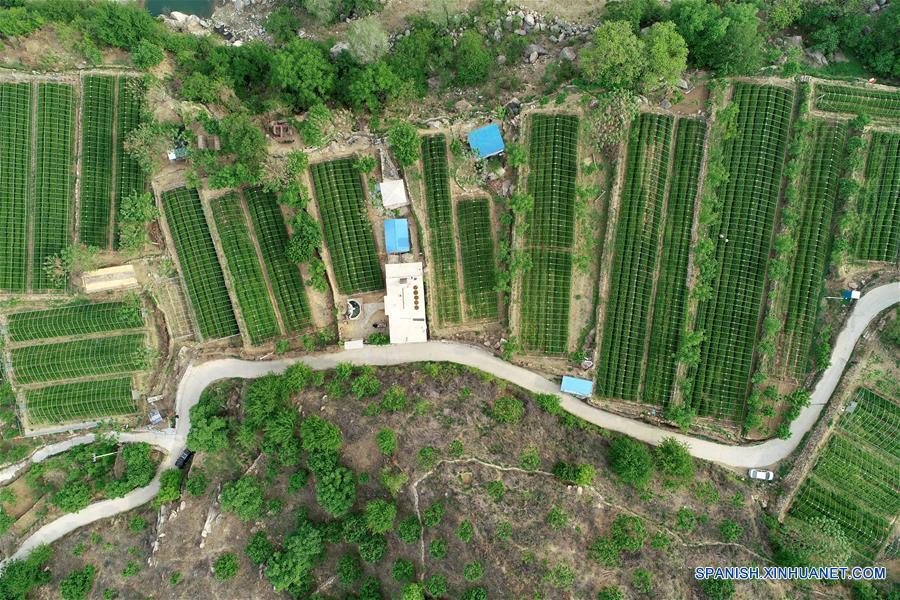HEBEI, 8 mayo, 2019 (Xinhua) -- Imagen del 7 de mayo de 2019 de una vista aérea del jardín de té de Qu Baomin, en la villa de Tonghua, en el condado de Lincheng, en la provincia de Hebei, en el norte de China. En el a?o 2012, Qu Baomin y su esposa Yang Suzhen contrataron 30 mu (dos hectáreas) de tierra para plantar té en la villa. Al pasar de los a?os, Qu Baomin se ha dedicado a cosechar orgánicamente su jardín de té para asegurar la alta calidad del té, por la que sus productos han sido bien recibidos en algunas grandes ciudades del país, incluyendo Beijing y Tianjin. Bajo su liderazgo en la plantación de té, más de 100 personas que viven en los alrededores han sido sacados de la pobreza. (Xinhua/Mu Yu)