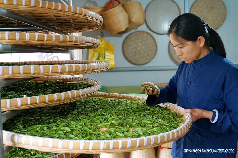 HEBEI, 8 mayo, 2019 (Xinhua) -- Imagen del 7 de mayo de 2019 de una empleada revisando la calidad del té en el jardín de té de Qu Baomin, en la villa de Tonghua, en el condado de Lincheng, en la provincia de Hebei, en el norte de China. En el a?o 2012, Qu Baomin y su esposa Yang Suzhen contrataron 30 mu (dos hectáreas) de tierra para plantar té en la villa. Al pasar de los a?os, Qu Baomin se ha dedicado a cosechar orgánicamente su jardín de té para asegurar la alta calidad del té, por la que sus productos han sido bien recibidos en algunas grandes ciudades del país, incluyendo Beijing y Tianjin. Bajo su liderazgo en la plantación de té, más de 100 personas que viven en los alrededores han sido sacados de la pobreza. (Xinhua/Mu Yu)