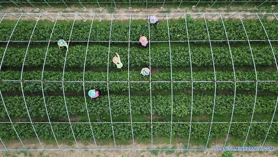 HEBEI, 8 mayo, 2019 (Xinhua) -- Imagen del 7 de mayo de 2019 de una vista aérea de trabajadores recolectando hojas de té en el jardín de té de Qu Baomin, en la villa de Tonghua, en el condado de Lincheng, en la provincia de Hebei, en el norte de China. En el a?o 2012, Qu Baomin y su esposa Yang Suzhen contrataron 30 mu (dos hectáreas) de tierra para plantar té en la villa. Al pasar de los a?os, Qu Baomin se ha dedicado a cosechar orgánicamente su jardín de té para asegurar la alta calidad del té, por la que sus productos han sido bien recibidos en algunas grandes ciudades del país, incluyendo Beijing y Tianjin. Bajo su liderazgo en la plantación de té, más de 100 personas que viven en los alrededores han sido sacados de la pobreza. (Xinhua/Mu Yu)