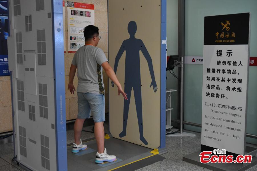 Demostración del control de seguridad con escáner de ondas milimétricas. La aduana de Kunming exhibe productos incautados vinculados a especies en peligro de extinción y la vida silvestre en el Aeropuerto Internacional de Changshui, Kunming, provincia de Yunnan, 8 de mayo del 2019. (Foto: servicio de noticias de China/ Ren Dong)