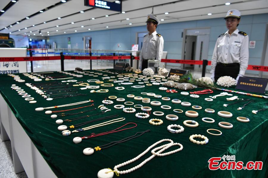 Kunming, 10/05/2019 (El Pueblo en Línea) - Productos de marfil que han sido incautados durante los controles realizados por la aduana de Kunming para proteger a las especies en peligro de extinción y la vida silvestre se exhiben en el Aeropuerto Internacional de Changshui, Kunming, provincia de Yunnan, 8 de mayo del 2019. (Foto: servicio de noticias de China/ Ren Dong)