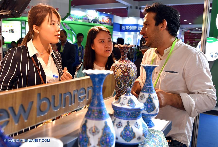 HENAN, 10 mayo, 2019 (Xinhua) -- Visitantes interactúan con un expositor durante la 7 exposición de productos característicos de China, en Sanmenxia, de la provincia de Henan, en el centro de China, el 10 de mayo de 2019. La exposición comenzó el viernes en Sanmenxia. (Xinhua/Li Jianan)