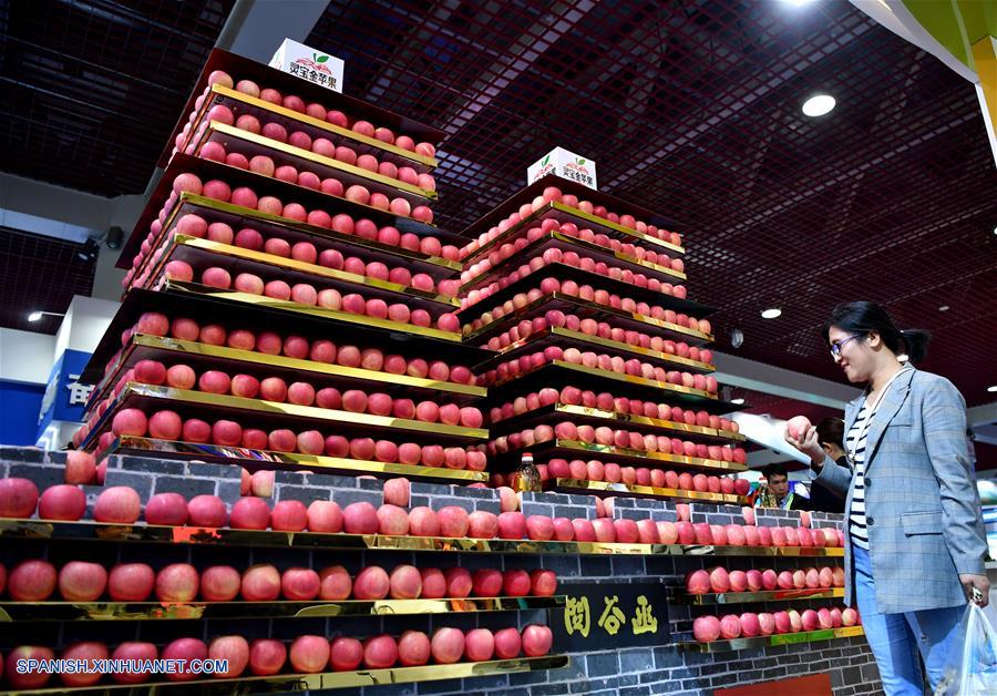 HENAN, 10 mayo, 2019 (Xinhua) -- Una persona selecciona una manzana de Lingbao, de la provincia de Henan, en el centro de China, durante la 7 exposición de productos característicos de China, en Sanmenxia, de la provincia de Henan, en el centro de China, el 10 de mayo de 2019. La exposición comenzó el viernes en Sanmenxia. (Xinhua/Li Jianan)