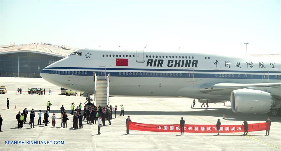 Un avión de pasajeros de Air China, llega al Aeropuerto Internacional Daxing de Beijing, en Beijing, capital de China, el 13 de mayo de 2019. El Aeropuerto Internacional de Daxing, en Beijing, realizó el lunes sus primeras pruebas de aterrizaje, recibiendo sin inconvenientes cuatro aviones de pasajeros.(Xinhua/Cai Yang)