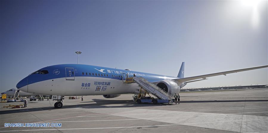 Una aeronave de Xiamen Airlines se prepara para realizar un vuelo de prueba en el Aeropuerto Internacional Daxing de Beijing, en Beijing, capital de China, el 13 de mayo de 2019. El Aeropuerto Internacional de Daxing, en Beijing, realizó el lunes sus primeras pruebas de aterrizaje, recibiendo sin inconvenientes cuatro aviones de pasajeros. Las compa?ías nacionales China Southern Airlines, China Eastern Airlines, Air China y Xiamen Airlines enviaron sus modelos insignias, Airbus A380, Airbus A350-900, Boeing 747-8 y Boeing 787-9, respectivamente, para realizar las maniobras. (Xinhua/Cai Yang)