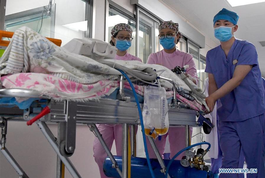 Xie Yadong (a la derecha) y sus colegas transfieren a un paciente en el Hospital del Pueblo de Henan, Zhengzhou, provincia de Henan, 10 de mayo del 2019. Xie, de 29 a?os, ha trabajado durante cinco a?os en este hospital. [Foto: Xinhua]