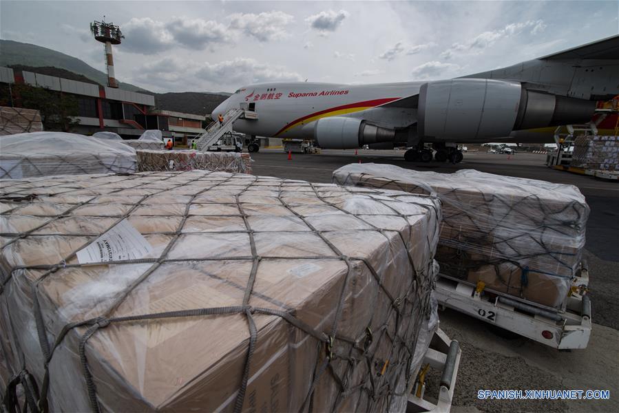 VARGAS, 13 mayo, 2019 (Xinhua) -- Trabajadores descargan 71 toneladas de fármacos y materiales médicos procedentes de China, en el Aeropuerto Internacional Simón Bolívar, en el estado de Vargas, Venezuela, el 13 de mayo de 2019. (Xinhua/Marcos Salgado)