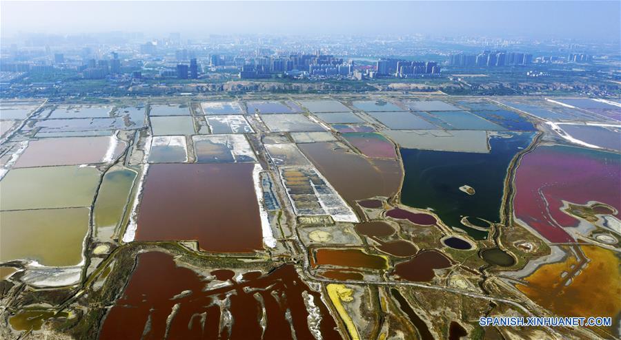 SHANXI, 13 mayo, 2019 (Xinhua) -- Imagen del 23 de abril de 2019 de una vista aérea del paisaje del lago salado en la ciudad de Yuncheng, en la provincia de Shanxi, en el norte de China. El evento temático "Día de Shanxi" se llevó a cabo como parte de la Exposición Internacional de Horticultura de Beijing, que comenzó el 12 de mayo. El Jardín de Shanxi presenta su tarea de reverdecer y reforestar así como su concepto de desarrollo verde en la exposición. Sin depender en su industria de carbón para el crecimiento, Shanxi se ha comprometido a desarrollar energía limpia y otras industrias emergentes para alcanzar un equilibrio entre protección al medio ambiente y crecimiento económico. (Xinhua/Cao Yang)