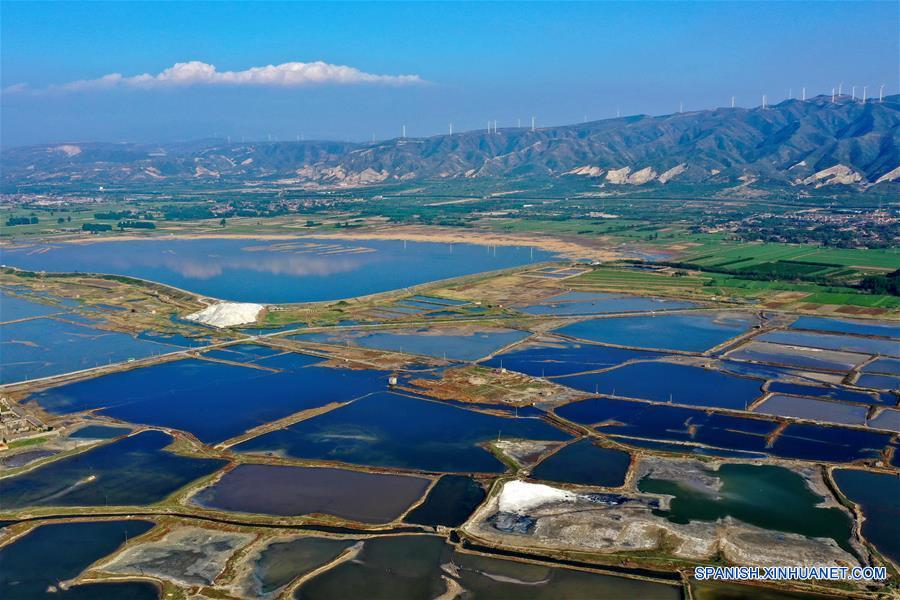 SHANXI, 13 mayo, 2019 (Xinhua) -- Imagen del 23 de abril de 2019 del paisaje del lago salado en la ciudad de Yuncheng, en la provincia de Shanxi, en el norte de China. El evento temático "Día de Shanxi" se llevó a cabo como parte de la Exposición Internacional de Horticultura de Beijing, que comenzó el 12 de mayo. El Jardín de Shanxi presenta su tarea de reverdecer y reforestar así como su concepto de desarrollo verde en la exposición. Sin depender en su industria de carbón para el crecimiento, Shanxi se ha comprometido a desarrollar energía limpia y otras industrias emergentes para alcanzar un equilibrio entre protección al medio ambiente y crecimiento económico. (Xinhua/Cao Yang)