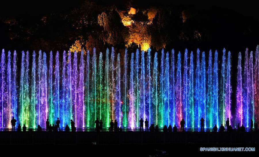 BEIJING, 14 mayo, 2019 (Xinhua) -- Turistas disfrutan de un espectáculo de luces en el Parque Forestal Olímpico en Beijing, capital de China, el 14 de mayo de 2019. Las autopistas y edificios fueron iluminados el martes por la tarde previo a la próxima Conferencia sobre Diálogo de las Civilizaciones Asiáticas (CDAC, por sus siglas en inglés) en Beijing. (Xinhua/Ju Huanzong)