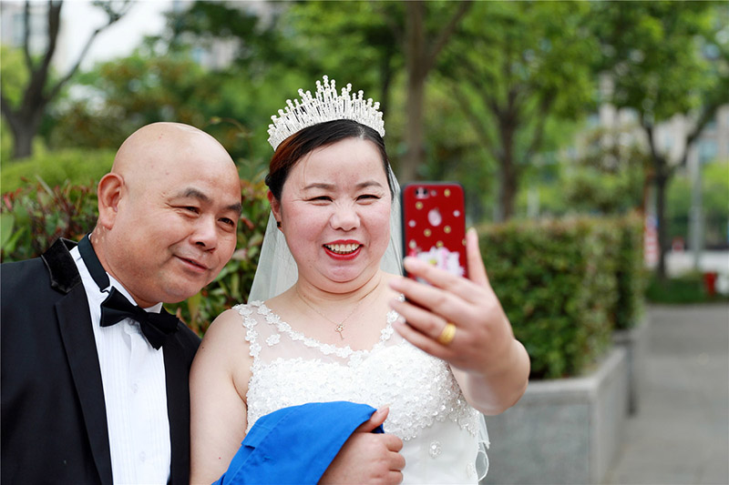 Wang Jiabao y su esposa conversan con sus hijos después de tomarse las fotos matrimoniales. Gracias a un programa patrocinado por el Centro de Servicio de Yangpu, un total de 50 parejas del distrito Yangpu, en Shanghai, que laboran en servicios comunales, podrán hacerse fotos matrimoniales. Este programa tiene como objetivo expresar la gratitud de la ciudad por sus trabajadores comunales. [Foto: Bo Kelin/ Chinadaily.com.cn]