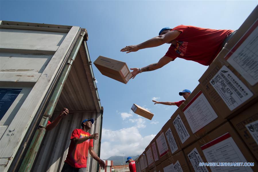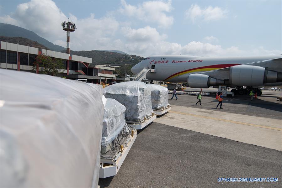 VARGAS, 16 mayo, 2019 (Xinhua) -- Trabajadores descargan contenedores de un avión de una aerolínea china, en el Aeropuerto Internacional Simón Bolívar, en el estado Vargas, Venezuela, el 16 de mayo de 2019. Venezuela recibió el jueves el tercer cargamento de asistencia técnica proveniente de China, con 64 toneladas de material médico quirúrgico, informó el ministro venezolano de Salud, Carlos Alvarado. (Xinhua/Marcos Salgado)