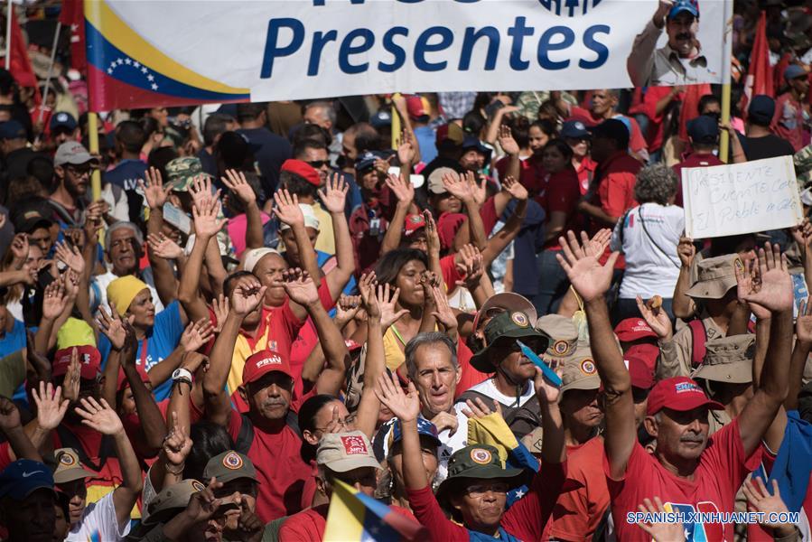 Personas participan durante una movilización en las cercanías del Palacio de Miraflores, a un a?o de la reelección del presidente venezolano, Nicolás Maduro, en Caracas, Venezuela, el 20 de mayo de 2019. El presidente de Venezuela, Nicolás Maduro, reiteró el lunes la propuesta para adelantar las elecciones legislativas, así como el llamado al diálogo como solución a la difícil situación que vive el país. (Xinhua/Marcos Salgado)