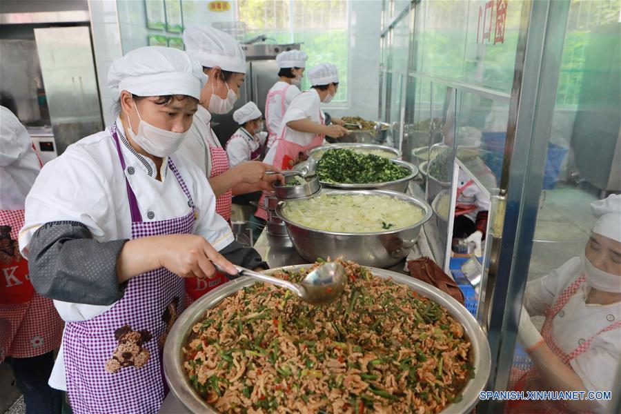 GUIZHOU, 21 mayo, 2019 (Xinhua) -- Empleadas preparan el almuerzo para estudiantes en la Escuela Primaria Número 11 de la ciudad de Tongren, en la provincia de Guizhou, en el suroeste de China, el 21 de mayo de 2019. La ciudad de Tongren ha establecido un sistema de monitoreo aplicando nuevas tecnologías de base de datos para rastrear la comida de la agricultura a la mesa del comedor, un esfuerzo para garantizar la seguridad alimentaria de los estudiantes. (Xinhua/Ou Dongqu)