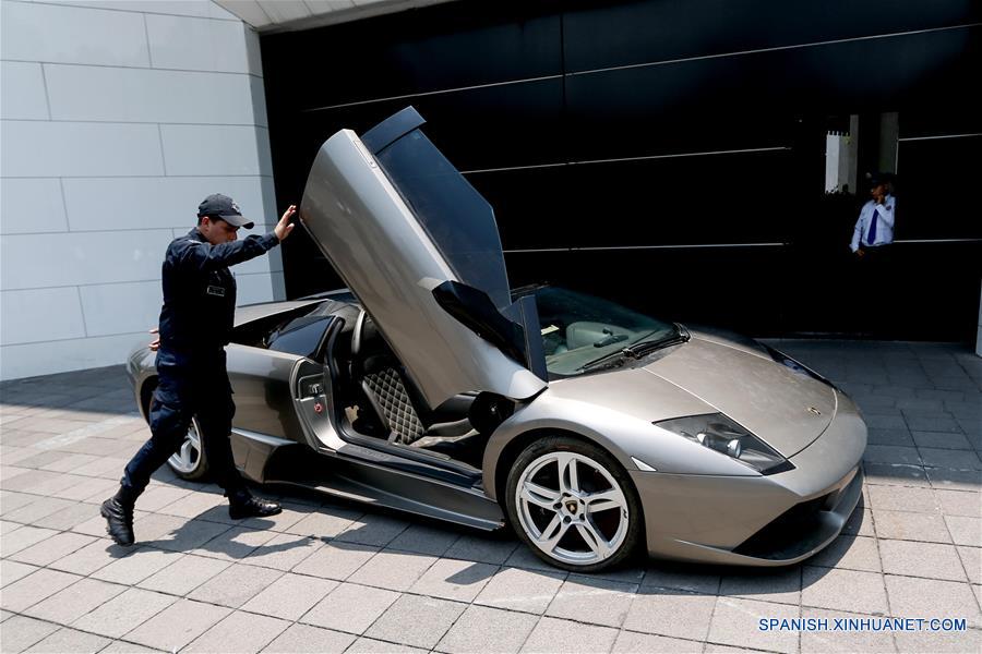 Una persona observa un vehículo exhibido al público previo a su subasta, en el Complejo Cultural Los Pinos, en la Ciudad de México, capital de México, el 21 de mayo de 2019. Un Lamborghini Murciélago plateado, pasando por una tanqueta militar, una ambulancia equipada y hasta un Volkswagen sedán, serán subastados a martillo el domingo en la capital mexicana. Los recursos que se obtengan serán destinados para ayudar a las dos comunidades más pobres del país, enclavadas en el sure?o estado de Oaxaca, precisó el martes el presidente mexicano Andrés Manuel López Obrador. (Xinhua/Francisco Ca?edo)