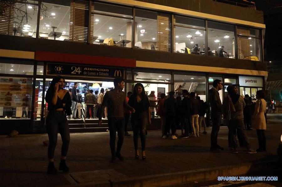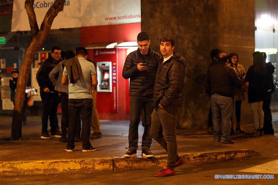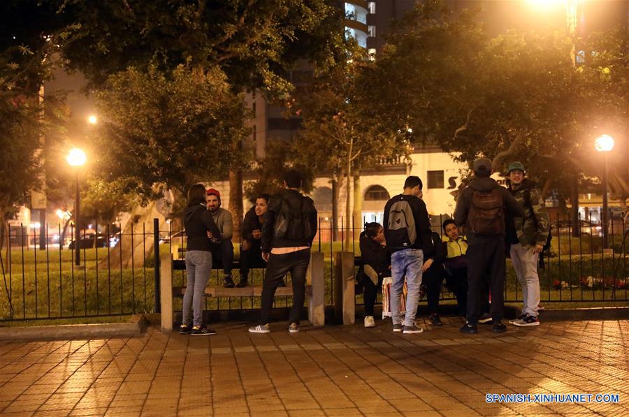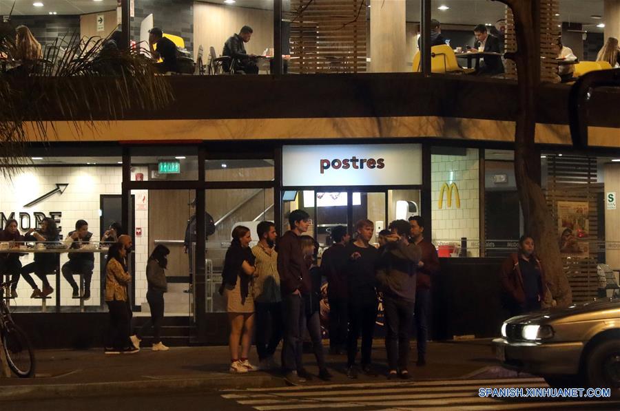 Personas reaccionan después de un sismo, en Lima, Perú, el 26 de mayo de 2019. Un fuerte sismo de magnitud 7,5 grados sacudió la madrugada del domingo el Perú, sintiéndose en Lima, confirmó el Instituto Geofísico del Perú (IGP), que hasta el momento no ha reportado víctimas ni da?os materiales. (Xinhua/Mariana Bazo)