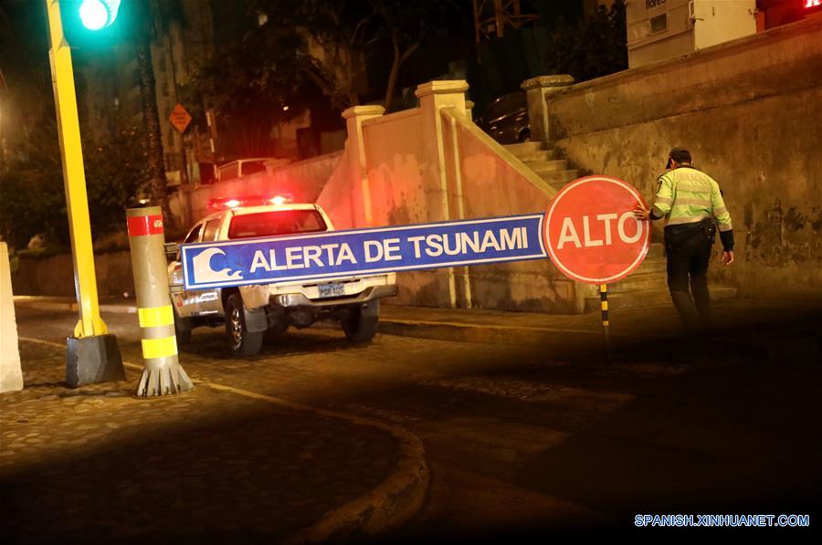 Un elemento de la policía mantiene cerrado un acceso a las playas de Miraflores como medida de precaución después de un sismo, en Lima, Perú, el 26 de mayo de 2019. Un fuerte sismo de magnitud 7,5 grados sacudió la madrugada del domingo el Perú, sintiéndose en Lima, confirmó el Instituto Geofísico del Perú (IGP), que hasta el momento no ha reportado víctimas ni da?os materiales. (Xinhua/Mariana Bazo)