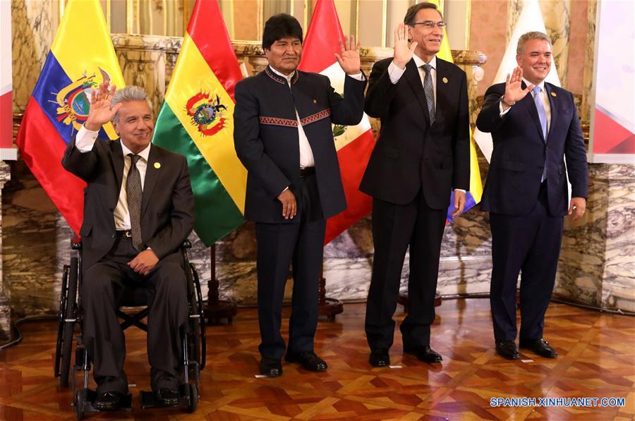 (De izq. a der.) Los presidentes de Ecuador, Lenín Moreno, de Bolivia, Evo Morales, de Perú, Martín Vizcarra, y de Colombia, Iván Duque, posan durante la XIX Cumbre Presidencial de la Comunidad Andina de Naciones (CAN) y el 45 Consejo de Ministros de Relaciones Exteriores de la CAN, en el marco de los 50 a?os del grupo regional, en Lima, Perú, el 26 de mayo de 2019. (Xinhua/Mariana Bazo)