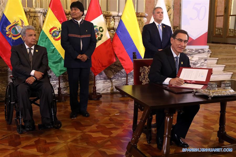 (De izq. a der.) Los presidentes de Ecuador, Lenín Moreno, de Bolivia, Evo Morales, de Perú, Martín Vizcarra, y de Colombia, Iván Duque, participan en la XIX Cumbre Presidencial de la Comunidad Andina de Naciones (CAN) y el 45 Consejo de Ministros de Relaciones Exteriores de la CAN, en el marco de los 50 a?os del grupo regional, en Lima, Perú, el 26 de mayo de 2019. (Xinhua/Mariana Bazo)
