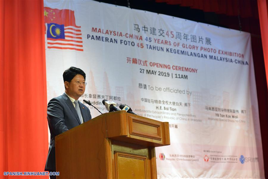 El embajador de China en Malasia, Bai Tian, pronuncia un discurso durante la ceremonia de apertura de una exposición fotográfica para conmemorar los 45 a?os de relaciones diplomáticas entre China y Malasia en Kuala Lumpur, Malasia, el 27 de mayo de 2019. La exposición fotográfica comenzó el lunes. Organizada por la Cámara de Comercio Malasia-China, la exposición denominada "Exposición Fotográfica 45 A?os de Gloria", presenta 120 fotografías que cubren los intercambios y el desarrollo en políticas, sociedad, economía y comercio, educación, deportes y otros campos en ambos países. (Xinhua/Chong Voon Chung)