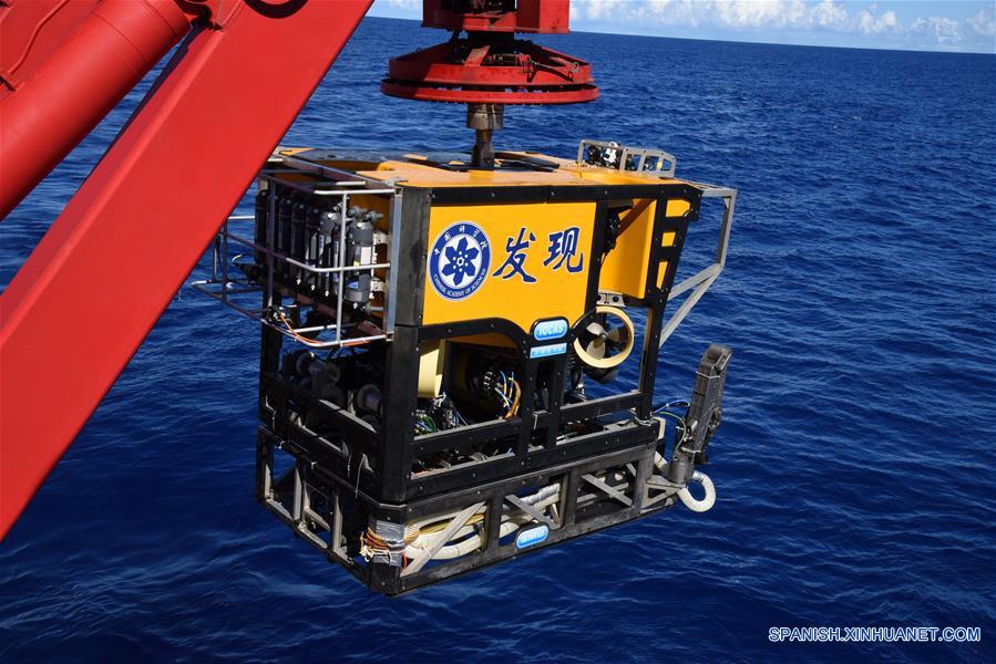 A BORDO DEL KEXUE, 27 mayo, 2019 (Xinhua) -- El vehículo operado remotamente (ROV, por sus siglas en inglés), Discovery, se sumerge en el sur de la Fosa de las Marianas, el 27 de mayo de 2019. El barco de investigación Kexue (Ciencia) de China, comenzó el lunes a explorar una serie de montes acuáticos en el sur de la Fosa de las Marianas, el lugar más profundo de la Tierra. El Vehículo Operado Remotamente (ROV), Discovery, se sumergió en el mar el lunes para recolectar videos, información y muestras de un peque?o monte acuático en el suroeste del área. (Xinhua/Zhang Xudong)