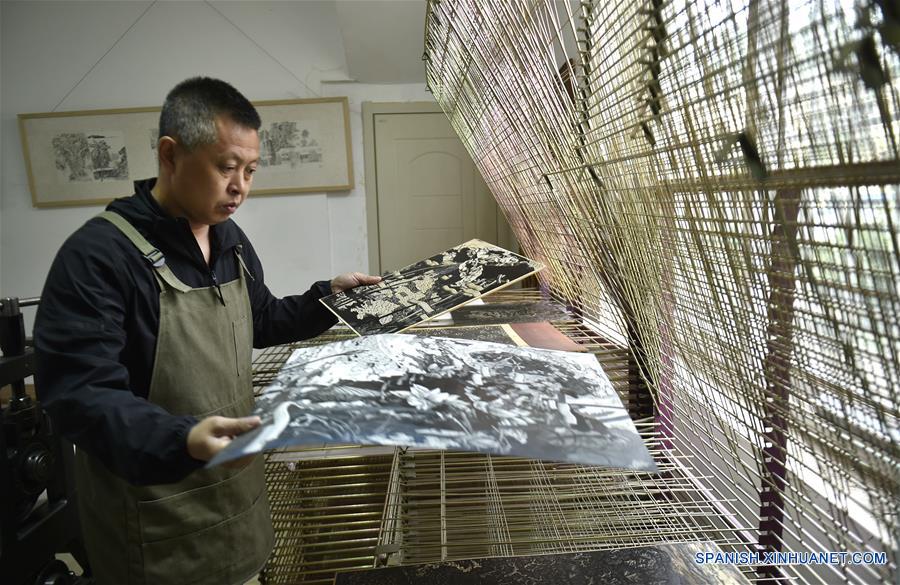 LIAONING, 28 mayo, 2019 (Xinhua) -- Imagen del 27 de mayo de 2019 de Chen Dongming aireando impresiones en madera en su estudio, en el distrito de Huanren de Benxi, provincia de Liaoning, en el noreste de China. Chen Dongming, impresor en madera de 52 a?os de edad de la villa de Wafang del distrito de Huanren de Benxi, aprendió las técnicas de su abuelo desde peque?o. Como heredero de la impresión en madera de Huanren, un patrimonio cultural inmaterial de la provincia de Liaoning, Chen se ha comprometido a realizar una integración adecuada de las impresiones de paisajes chinos tradicionales y las impresiones de A?o Nuevo en madera para promocionar el arte de manera innovadora. (Xinhua/Yao Jianfeng)