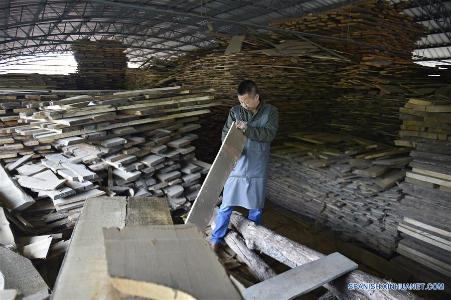 LIAONING, 28 mayo, 2019 (Xinhua) -- Imagen del 27 de mayo de 2019 de Chen Dongming eligiendo madera para elaborar impresiones en madera en uan fábrica, en el distrito de Huanren de Benxi, provincia de Liaoning, en el noreste de China. Chen Dongming, impresor en madera de 52 a?os de edad de la villa de Wafang del distrito de Huanren de Benxi, aprendió las técnicas de su abuelo desde peque?o. Como heredero de la impresión en madera de Huanren, un patrimonio cultural inmaterial de la provincia de Liaoning, Chen se ha comprometido a realizar una integración adecuada de las impresiones de paisajes chinos tradicionales y las impresiones de A?o Nuevo en madera para promocionar el arte de manera innovadora. (Xinhua/Yao Jianfeng)