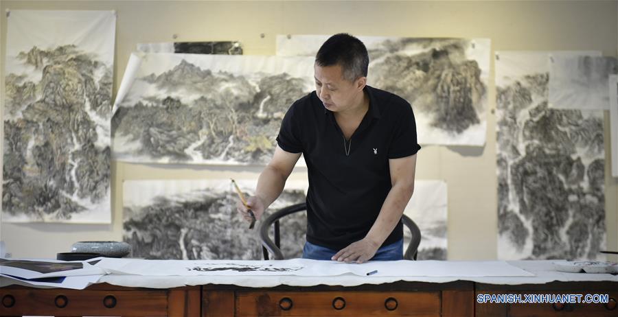 LIAONING, 28 mayo, 2019 (Xinhua) -- Imagen del 27 de mayo de 2019 de Chen Dongming trabajando en una impresión en madera en su estudio, en el distrito de Huanren de Benxi, provincia de Liaoning, en el noreste de China. Chen Dongming, impresor en madera de 52 a?os de edad de la villa de Wafang del distrito de Huanren de Benxi, aprendió las técnicas de su abuelo desde peque?o. Como heredero de la impresión en madera de Huanren, un patrimonio cultural inmaterial de la provincia de Liaoning, Chen se ha comprometido a realizar una integración adecuada de las impresiones de paisajes chinos tradicionales y las impresiones de A?o Nuevo en madera para promocionar el arte de manera innovadora. (Xinhua/Yao Jianfeng)