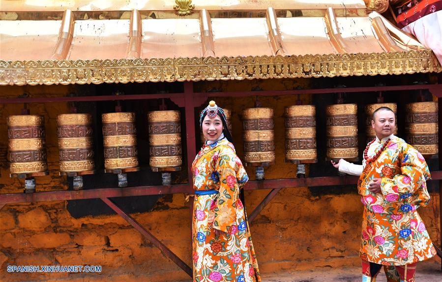 LHASA, 28 mayo, 2019 (Xinhua) -- Turistas posan en ropa tradicional tibetana, en la antigua ciudad de Lhasa, capital de la Región Autónoma del Tíbet, en el suroeste de China, el 28 de mayo de 2019. Muchos turistas decidieron tomarse una fotografía como recuerdo mientras usaban los bellos trajes tibetanos. (Xinhua/Chogo)