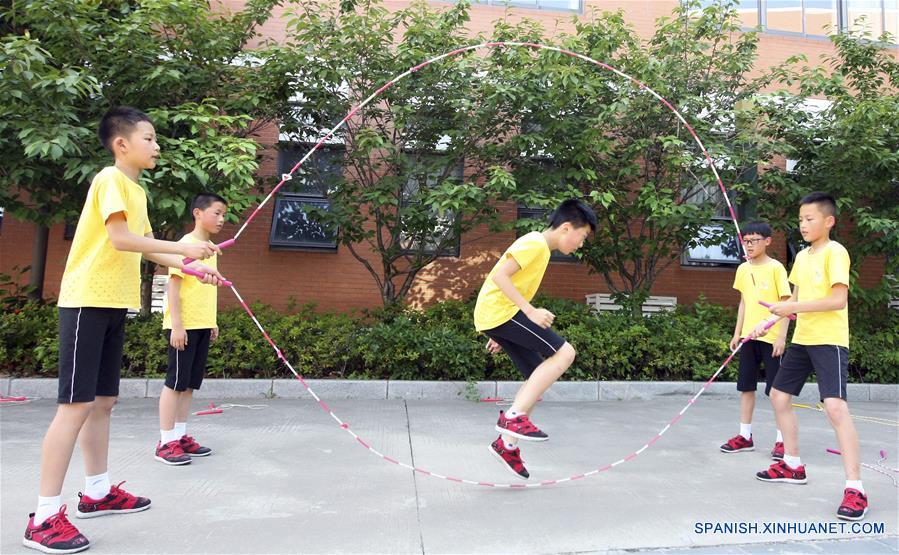 JIANGSU, 29 mayo, 2019 (Xinhua) -- Estudiantes juegan Double Dutch, un juego de saltar la cuerda, en un evento para dar la bienvenida al próximo Día Internacional del Ni?o en una escuela primaria, en Rugao, provincia de Jiangsu, en el este de China, el 29 de mayo de 2019. (Xinhua/Xu Peiqin)
