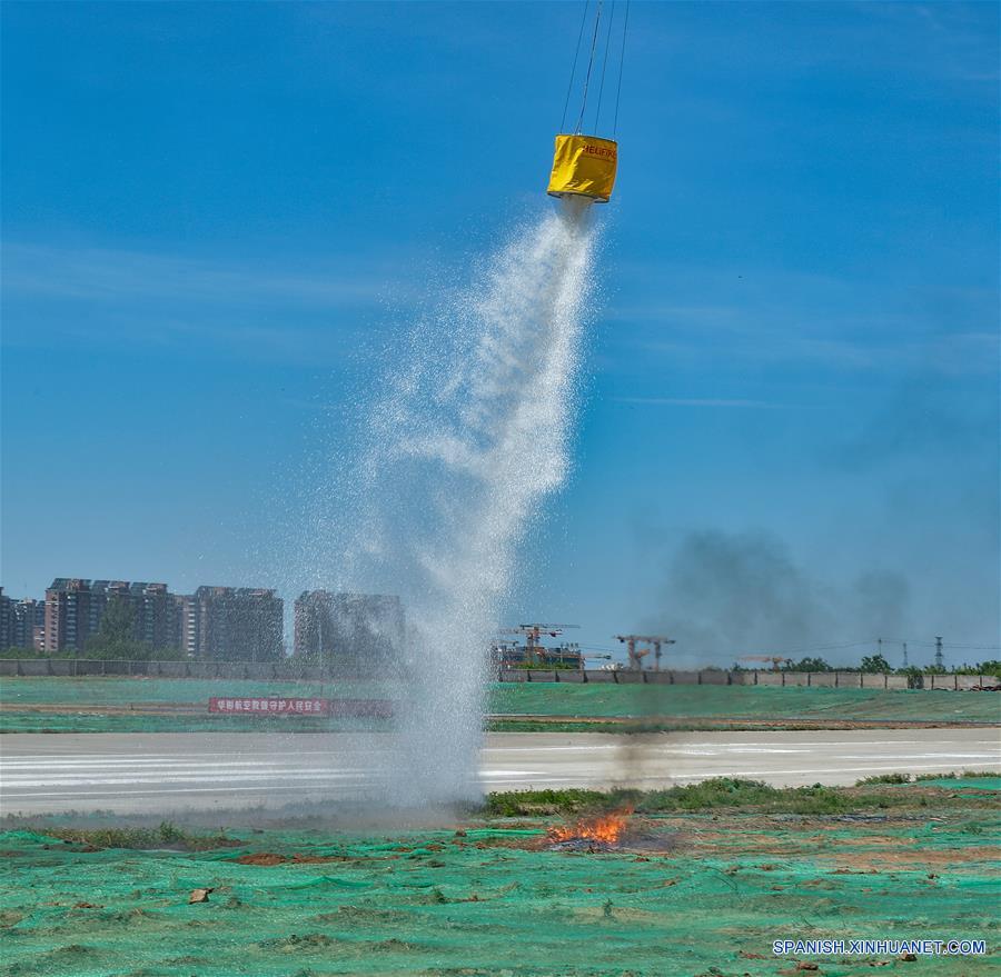 BEIJING, 31 mayo, 2019 (Xinhua) -- Un helicóptero apaga el fuego durante un simulacro en una exhibición sobre recate médico aéreo, en el distrito de Miyun de Beijing, capital de China, el 31 de mayo de 2019. (Xinhua/Yang Guang)