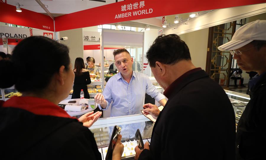 Imagen del 31 de mayo de 2019 de un expositor (c) de Polonia mostrando productos de joyería a los visitantes, personas visitando un puesto de frazadas, en Shanghai, en el este de China. La Exposición de Marcas de la Franja y La Ruta 2019 comenzó el viernes en el Centro de Exposiciones de Shanghai. (Xinhua/Fang Zhe)