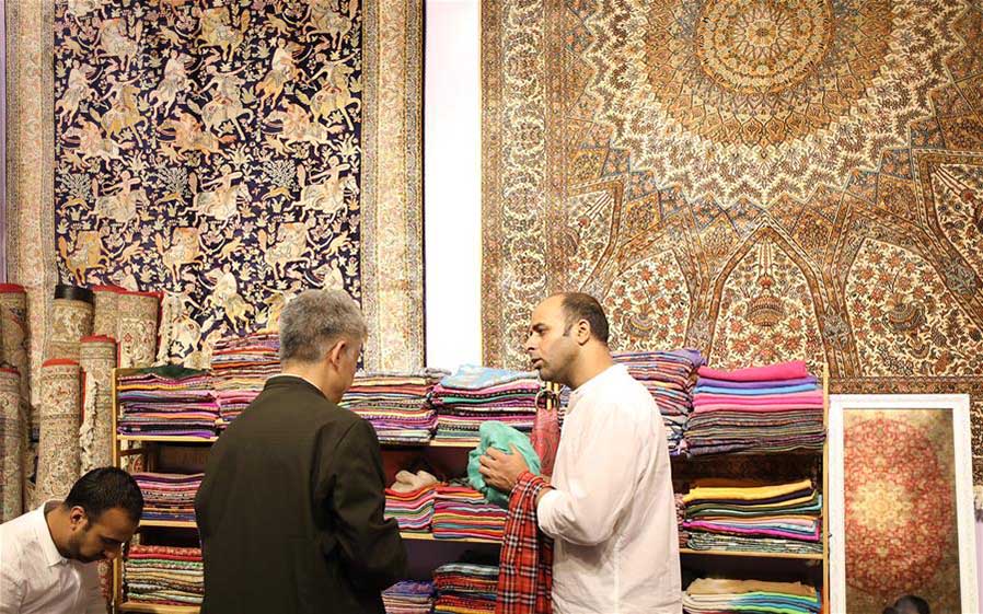 Imagen del 31 de mayo de 2019 de un expositor (d) mostrando bufandas de seda a un visitante, en Shanghai, en el este de China. La Exposición de Marcas de la Franja y La Ruta 2019 comenzó el viernes en el Centro de Exposiciones de Shanghai. (Xinhua/Fang Zhe)