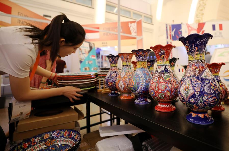 Imagen del 31 de mayo de 2019 de una empleada acomodando los artículos de Turquía, en Shanghai, en el este de China. La Exposición de Marcas de la Franja y La Ruta 2019 comenzó el viernes en el Centro de Exposiciones de Shanghai. (Xinhua/Fang Zhe)