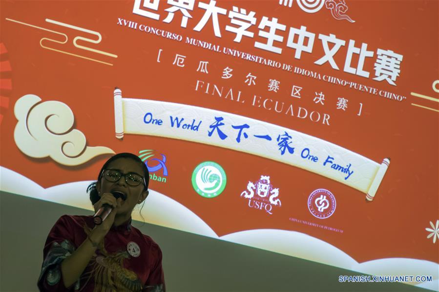 QUITO, 2 junio, 2019 (Xinhua) -- La estudiante Katherine Valle, del Instituto Confucio de la Universidad San Francisco de Quito (USFQ), participa en una prueba de canto durante el XVIII Concurso Mundial Universitario "Puente Chino 2019", en el Instituto Confucio de la USFQ, en Quito, Ecuador, el 2 de junio de 2019. El XVIII Concurso Mundial Universitario "Puente Chino 2019" se realizó el domingo en Quito, donde nueve estudiantes demostraron el dominio del idioma chino y sus conocimientos sobre la cultura e historia del país asiático. (Xinhua/Santiago Armas)